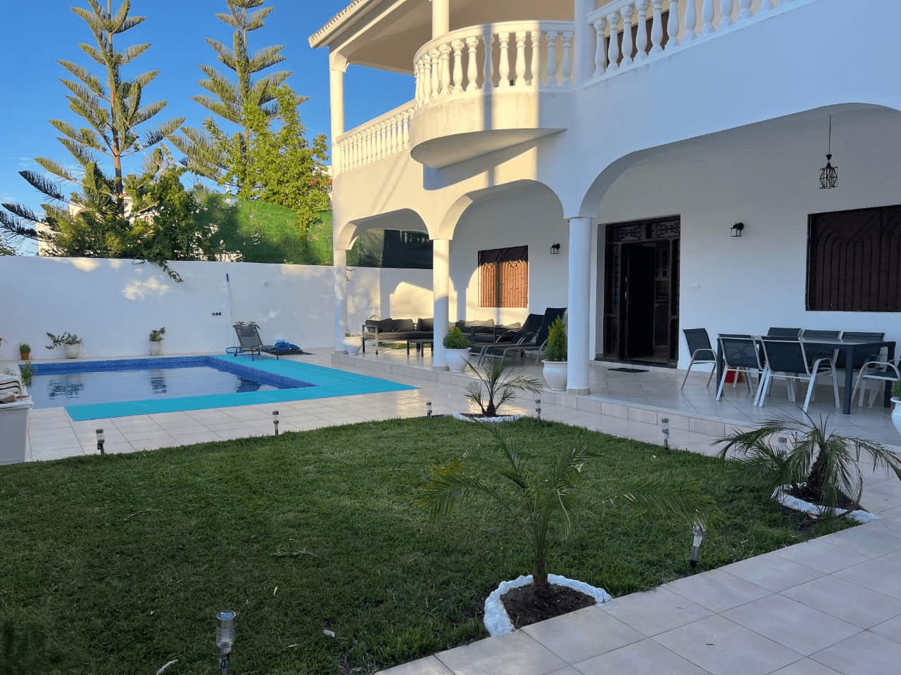 Enjoy a premium short-term stay in this spacious villa for rent in the sought-after coastal area of Martil, near Caponegro. Priced at 1,600 dirhams per day, this newly built, fully furnished villa offers a comfortable and stylish living experience across multiple floors. The property features 4+ bedrooms and 3 bathrooms, making it ideal for families or groups. With generous indoor and outdoor spaces—including a terrace and a rooftop terrace—you can relax and take in the peaceful surroundings, all while being conveniently close to schools and local amenities. Designed for both comfort and security, the villa includes a private pool, garden, playground, and dedicated parking. Set within a secure environment with CCTV surveillance, it ensures privacy and peace of mind throughout your stay. Whether you're planning a short getaway or an extended monthly stay, this villa combines space, convenience, and modern features in one of the region’s most desirable coastal locations.